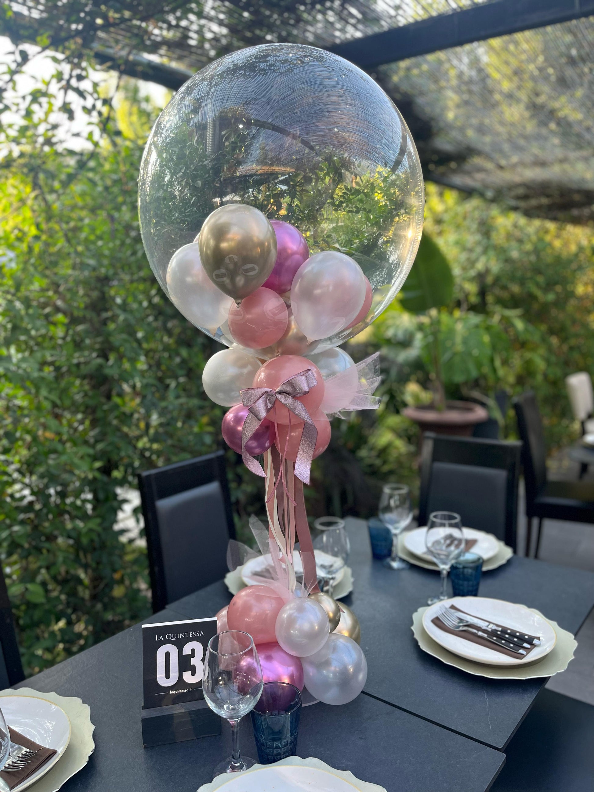 Rendi il tuo evento ancora più elegante con questo meraviglioso centrotavola di palloncini! Perfetto per matrimoni, compleanni, baby shower e feste esclusive, questo design sofisticato con palloncino bubble trasparente e mini palloncini all'interno aggiunge un tocco di magia alla tua tavola.