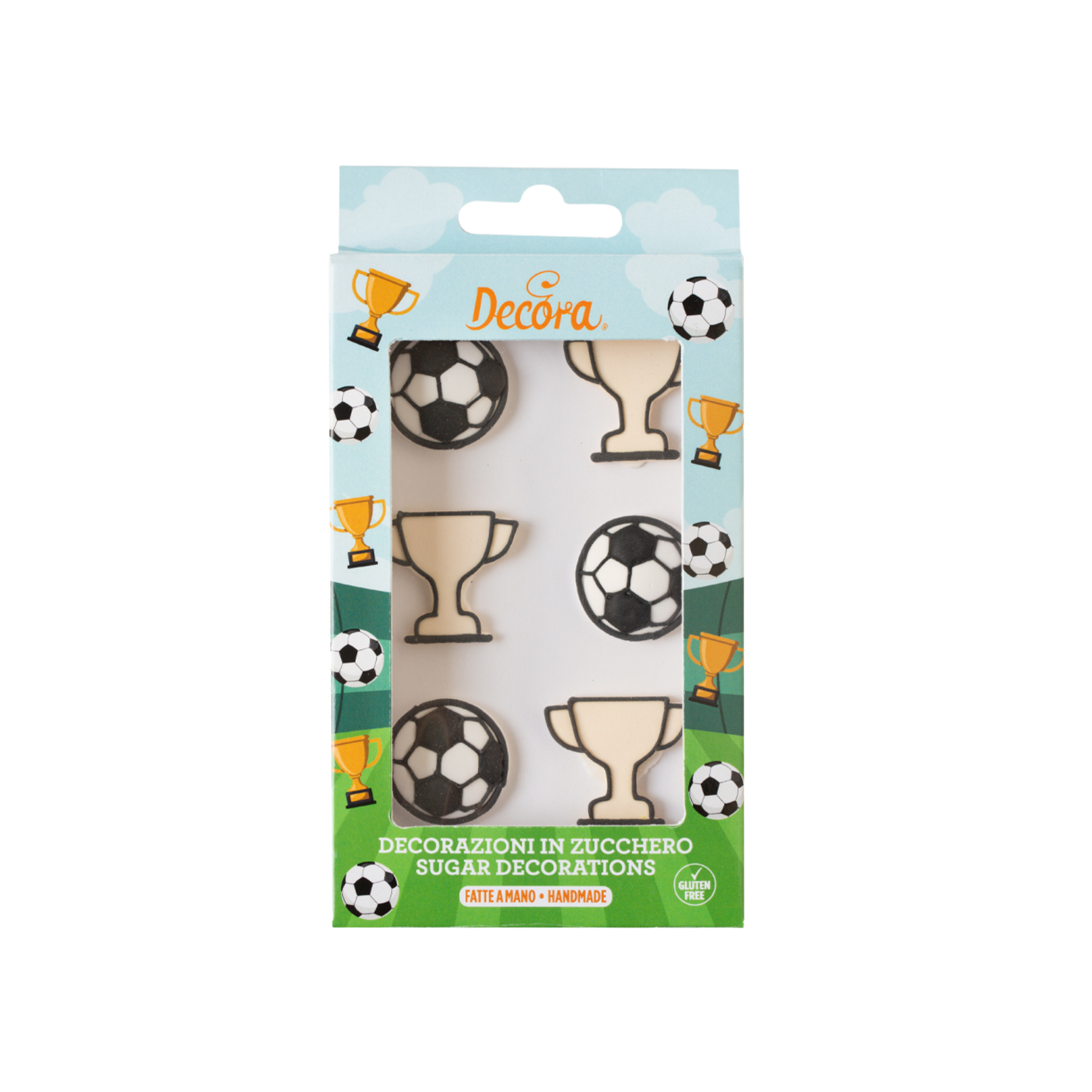 Decorazioni in zucchero pronte all'uso. Realizzate a mano, con coloranti di estrazione naturale, le decorazioni Champions Decora sono perfette per decorare facilmente torte, cupcakes, biscotti e dolcetti. Ogni confezione contiene 6 decorazioni assortite in due soggetti a tema calcio: coppe e palloni da calcio. Sono ideali per dare quel tocco in più che renderà unico ogni vostra creazione.