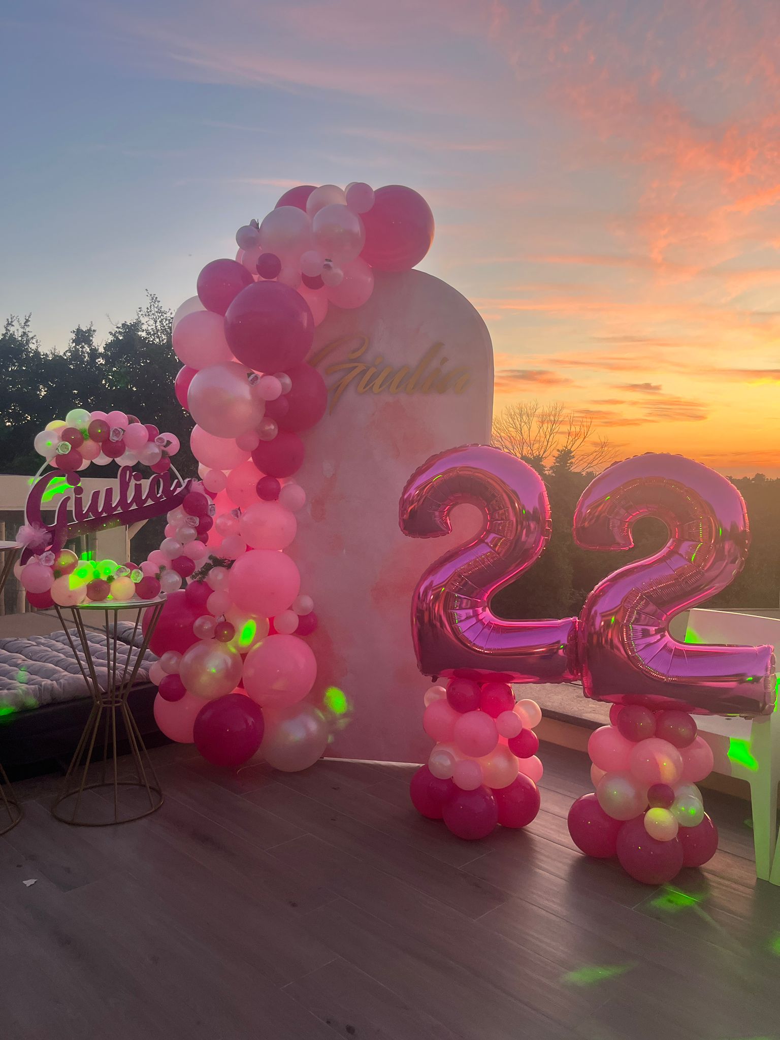 Composizione composta da vela personalizzabile con sfondo e nome, semi arco, 2 colonne con numero, set di tavoli e cerchio con nome all'interno