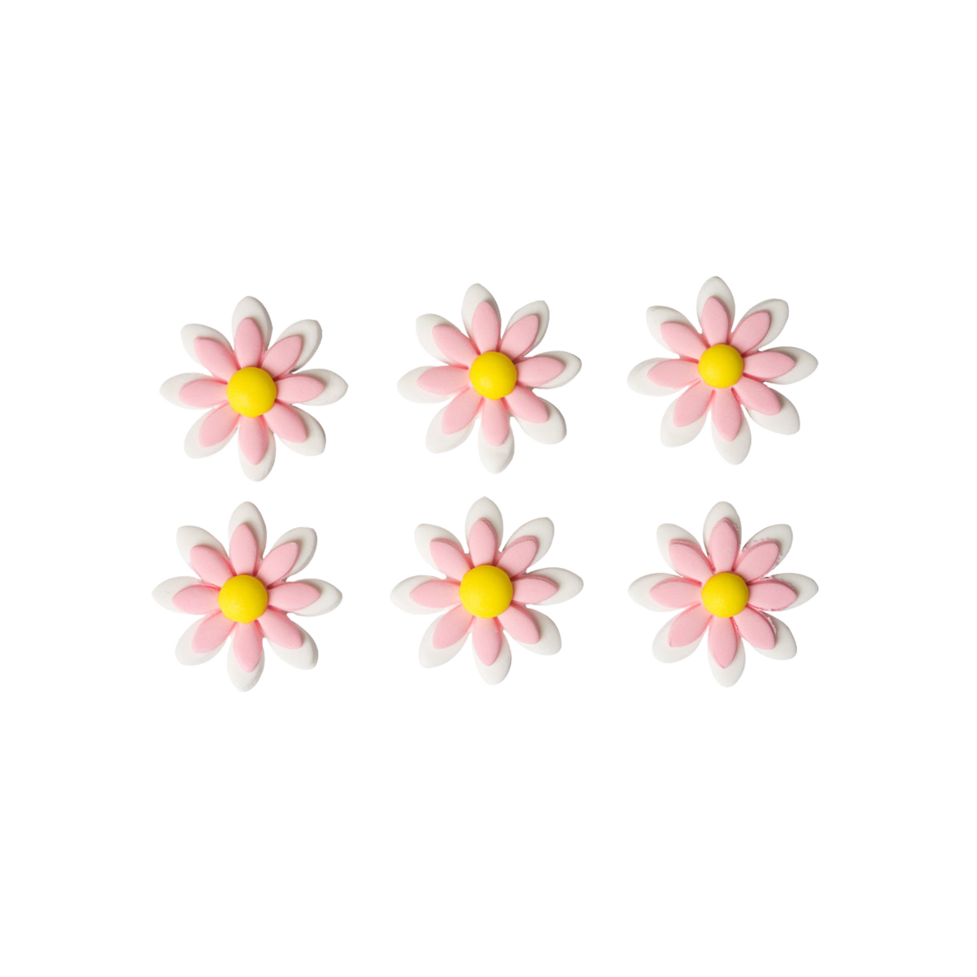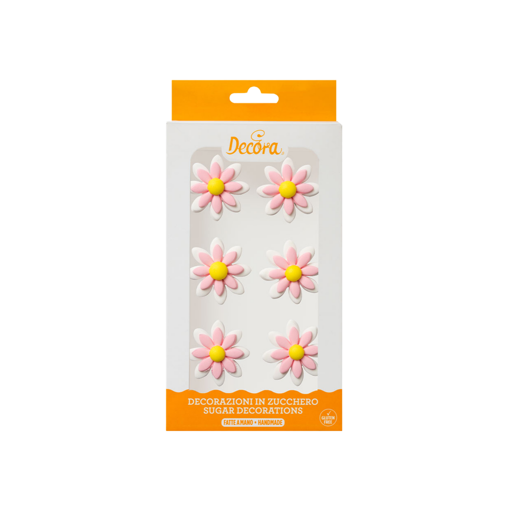 Margherite in zucchero pronte all'uso. Realizzate a mano, con coloranti di estrazione naturale, le margherite Decora sono perfette per decorare facilmente torte, cupcakes, biscotti e dolcetti. Ogni confezione contiene 6 margherite con petali rosa e bianchi. Sono ideali per dare quel tocco in più che renderà unico ogni vostra creazione.