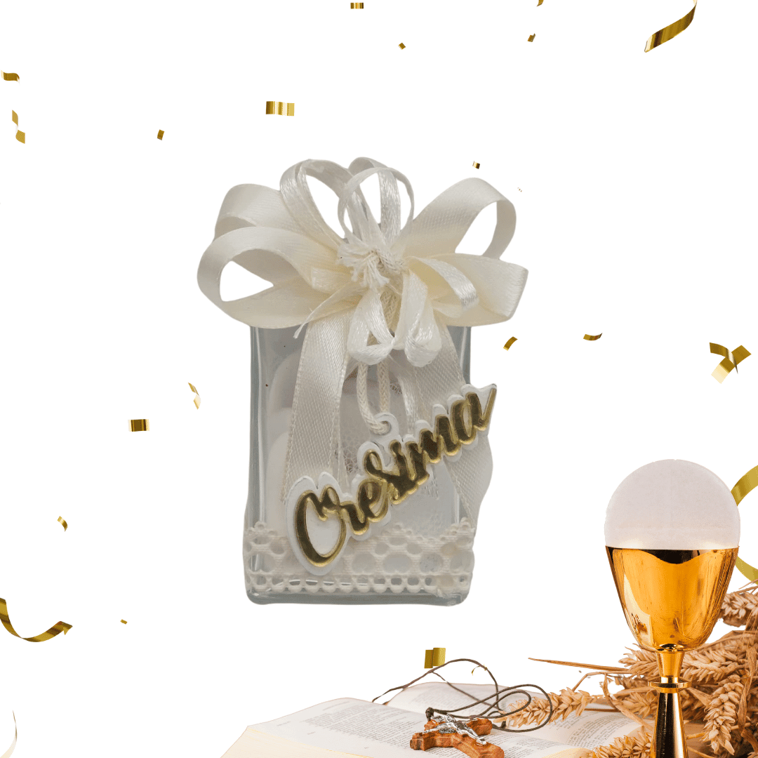 Un pensiero delicato che unisce simbolismo e dolcezza, questo sacchetto contiene un gessetto a tema Cresima per aggiungere un tocco unico alla celebrazione.