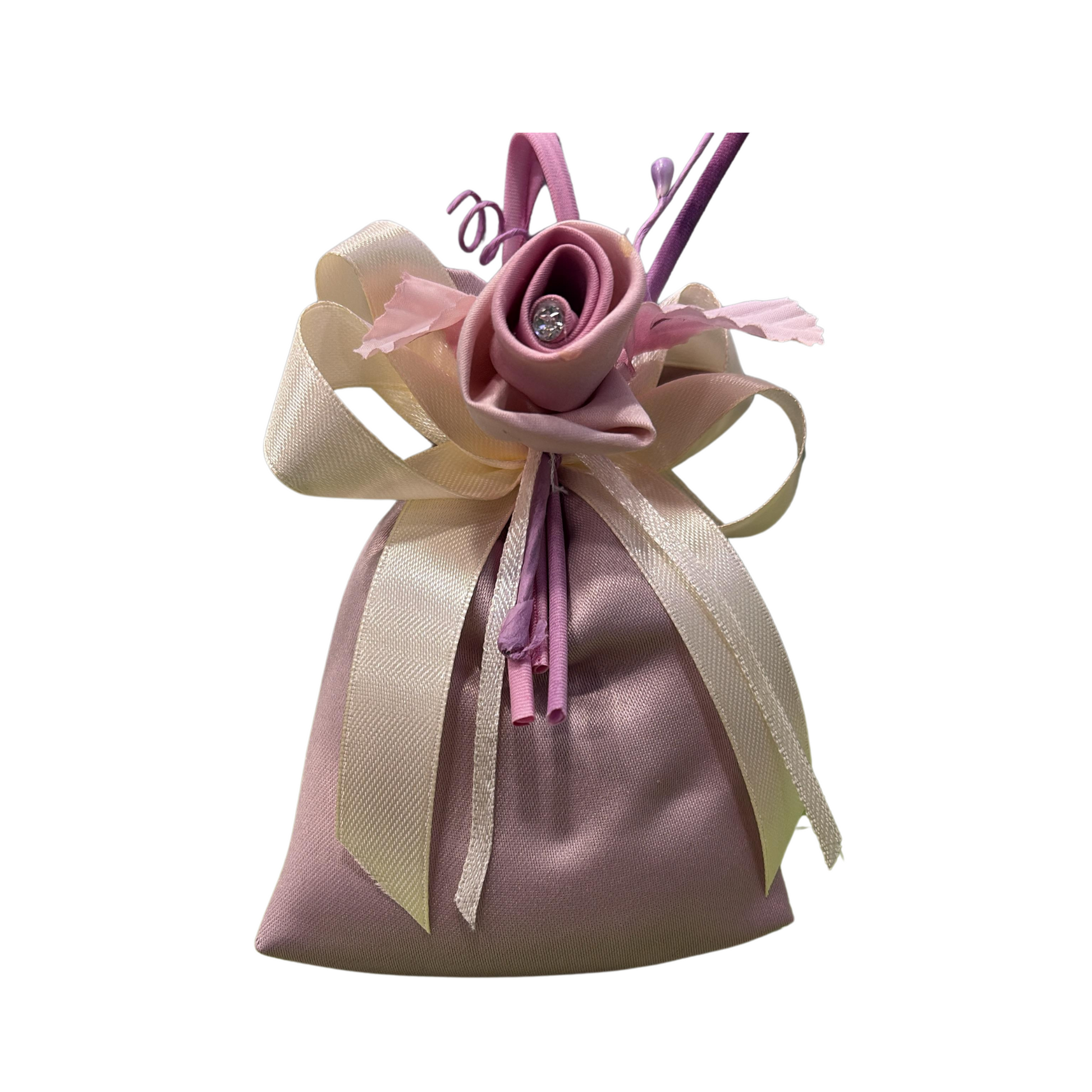 Aggiungi un tocco di raffinatezza al tuo evento con questo elegante sacchetto in tessuto, ideale per matrimoni, comunioni e cresime. Realizzato con cura e impreziosito da un fiocco in raso e una delicata rosa decorativa, questo sacchetto è perfetto per sorprendere i tuoi ospiti con un ricordo speciale.